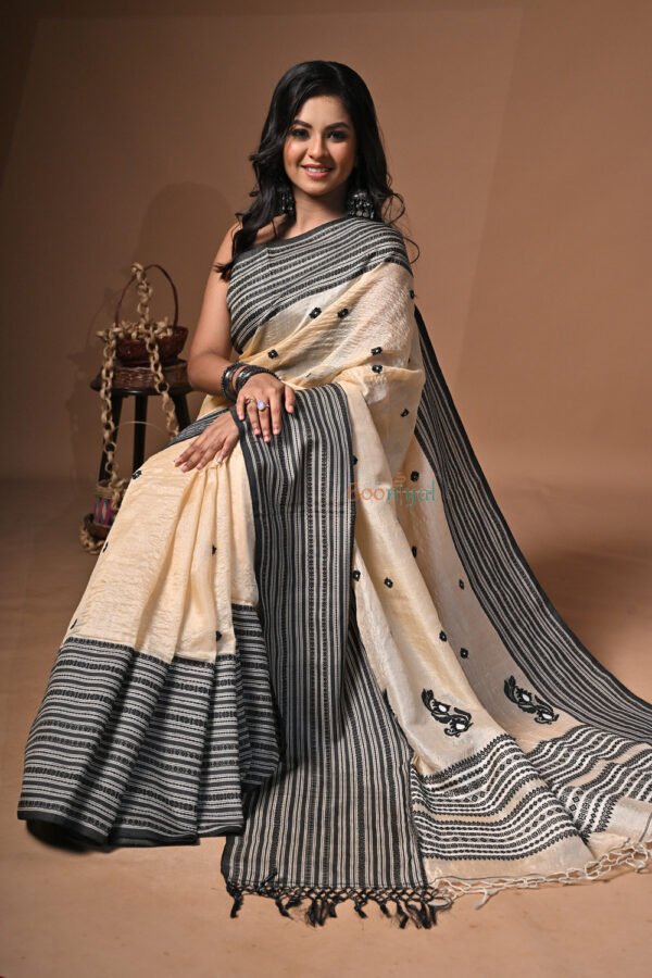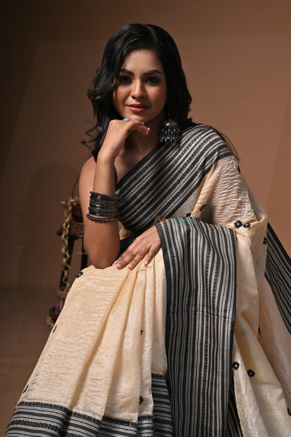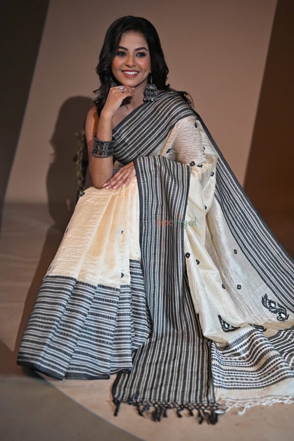 Step into timeless elegance with Booniyal Boutique’s Pure Tussar Saree, adorned with exquisite Jamdani weaving – a rare blend of Bengal’s textile heritage and modern sophistication.